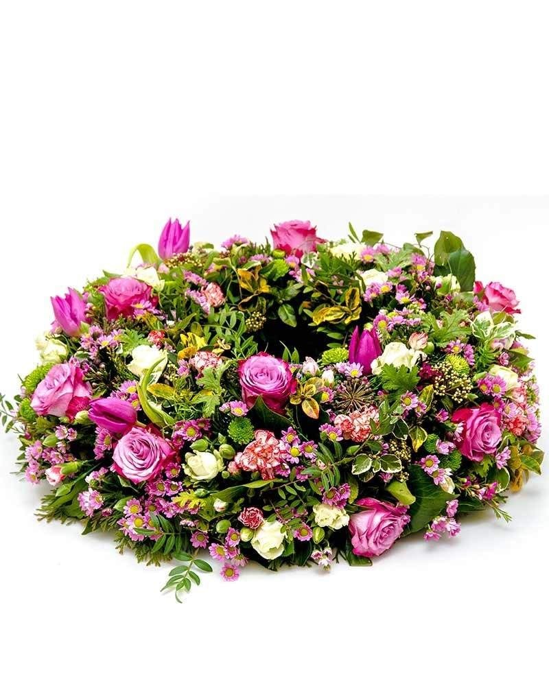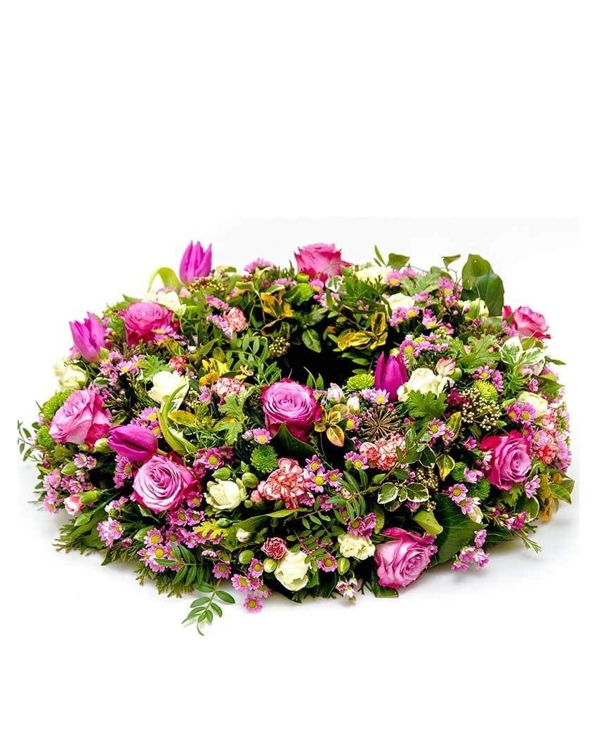 Hermoso centro de flores fúnebre hecho en forma circular en el que destacan las flores en tonos rosados y fucsias. Esta compuesto de rosas, margaritas, tulipanes, paniculata y feeling green, entre otras flores. La entrega urgente en capillas, velatorios, tanatorios e iglesias de Madrid, la cinta con inscripción dedicatoria y el IVA están incluidos en el precio del centro de flores funeral.