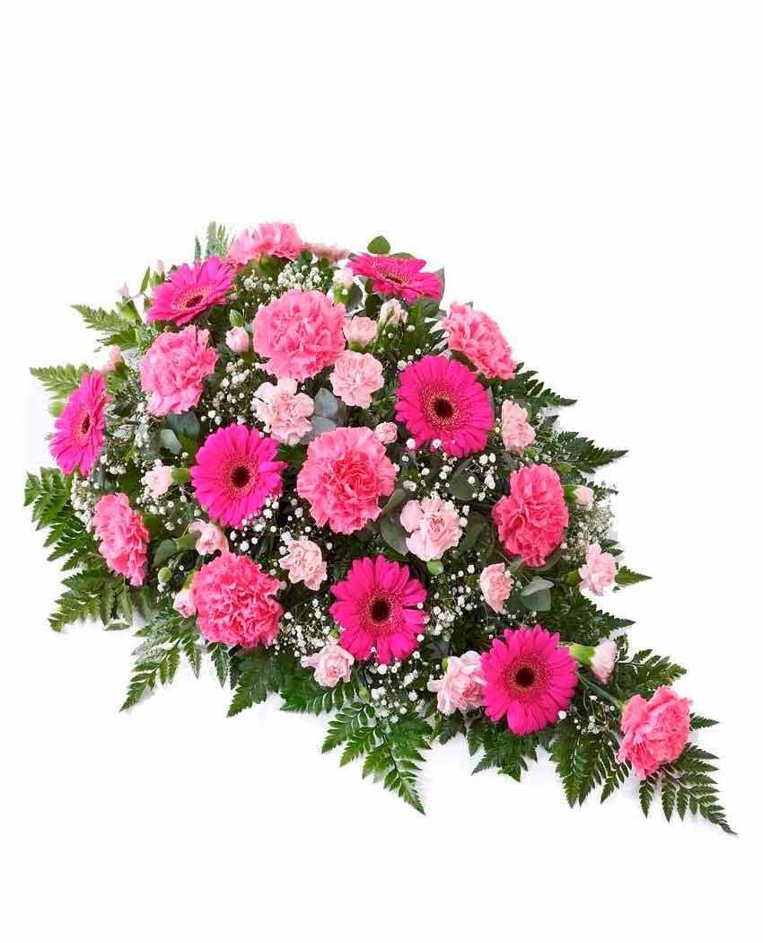 Almohadón de flores funeral hecho con colores suaves y luminosos. Este centro de flores fúnebres de forma ovalada esta hecho con claveles de color rosa pálido y gerberas fucsia que obtienen un aspecto visual suave, luminoso y elegante. El envío urgente a tanatorios, capillas, velatorios e iglesias, la cinta con dedicatoria personal, familiar, de empresa o corporativa y el IVA están incluidos en el precio del producto.