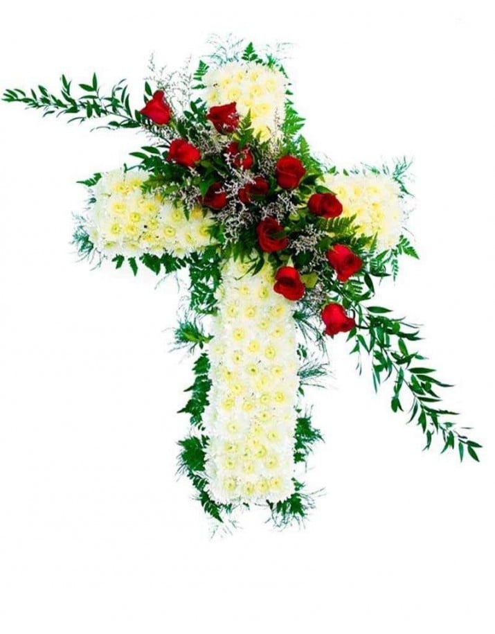 Cruz de flores para funerales. Arreglo floral en forma de cruz compuesto con margaritas blancas y rosas de color rojo. Es una composición llena de luz y serenidad. 72 cms en su medida más larga.