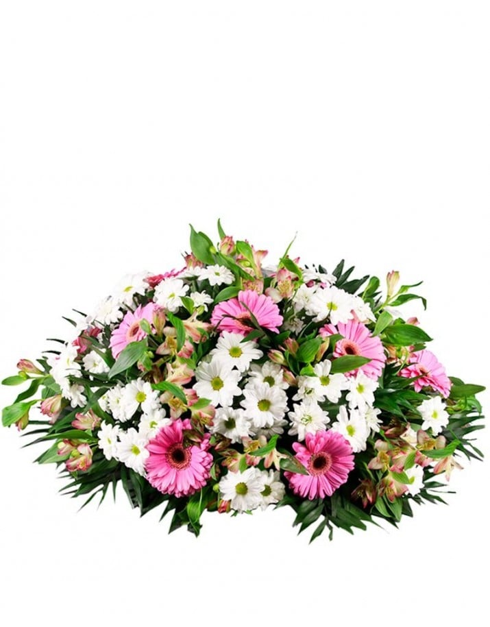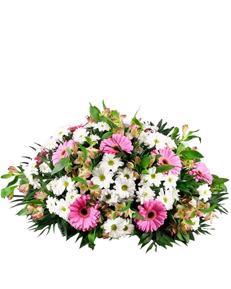 Centro de funeral ovalado con forma de almohadón hecho con flores variadas que consiguen realzar el contraste entre los colores blancos y rosas. El precio incluye entrega urgente gratuita en tanatorios, capillas e iglesias de Madrid y cinta dedicatoria personalizada. Puede realizar sus pedidos online o llamando por teléfono a cualquiera de nuestras tiendas o al 609 843 910.
