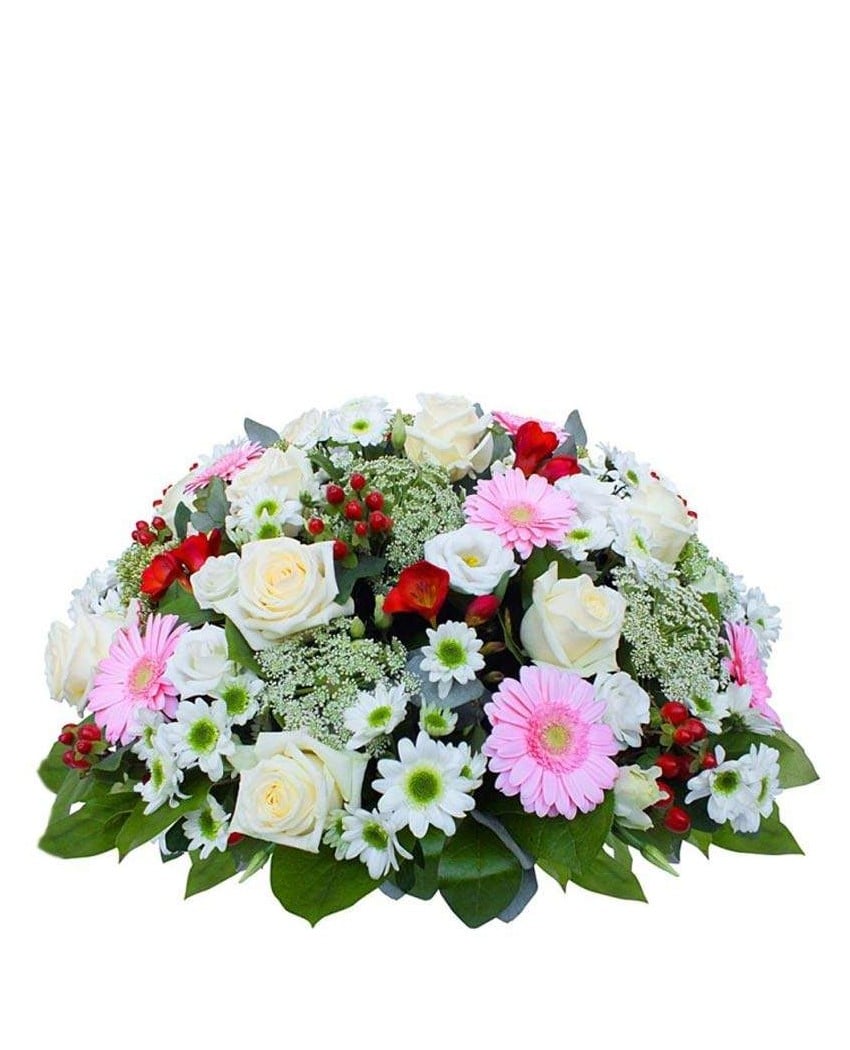 Centro de flores fúnebres redondo, elegante, suave y luminoso. Esta compuesto por gerberas, rosas, lisianthus, margaritas, hypericum y verdes variados. El precio incluye entrega en tanatorios, capillas y velatorios. Haga su pedido online o llame por teléfono a cualquiera de nuestras tiendas: 91 515 04 13 /91 591 79 91. Si tu pedido es muy urgente, llama al número de teléfono 609 843 910.