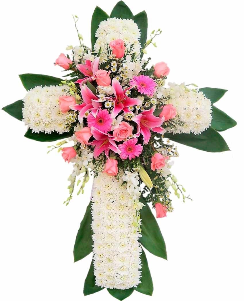 Suave y luminosa composición floral funeraria hecha con colores rosados sobre fondos blancos. El centro de la estructura en cruz está rematado con un centro de flores que destaca y le da armonía al conjunto. Está hecha con margaritas, rosas, camomila o aster blanco, gerberas, dragonarias o alhelís y lirios orientales rosa. El precio incluye entrega urgente en tanatorios de Madrid, banda con dedicatoria personal o de empresa e I.V.A.