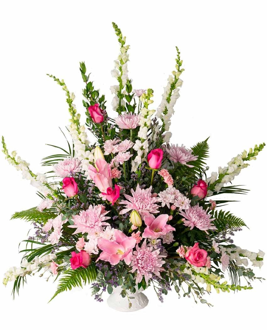 Centro floral funerario elegante y sofisticado. Estructura piramidal de verdes variados sobre los que se emplazan dragonarias o alhelís, crisantemos anastasia, rosas, lirios orientales rosa, margaritas, claveles carnelia y statice. El precio incluye entrega urgente en tanatorios de Madrid, banda con dedicatoria personal, familiar o de empresa e I.V.A.