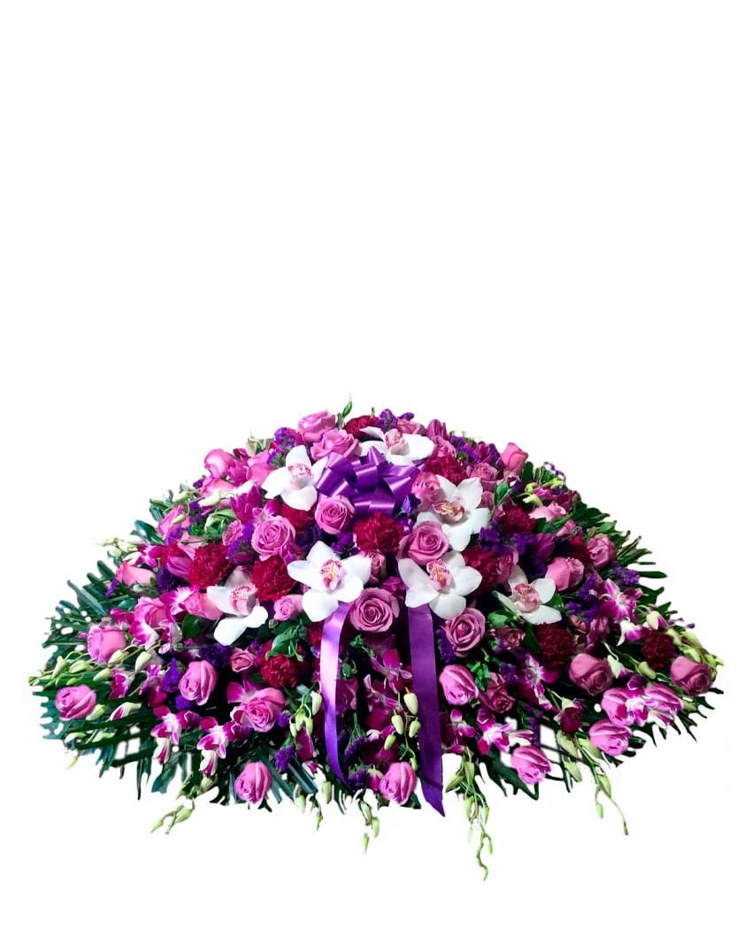 Composición floral funeraria intensa, elegante y estilizada. Está hecho con flores variadas en colores púrpura, violetas, fucsias y pinceladas blancas. El tamaño de este centro de flores es grande, 1,20 m de largo por 65 cms de altura. El precio incluye entrega urgente en tanatorios, velatorios, capillas e iglesias, I.V.A y banda con dedicatoria personal, familiar o corporativa.