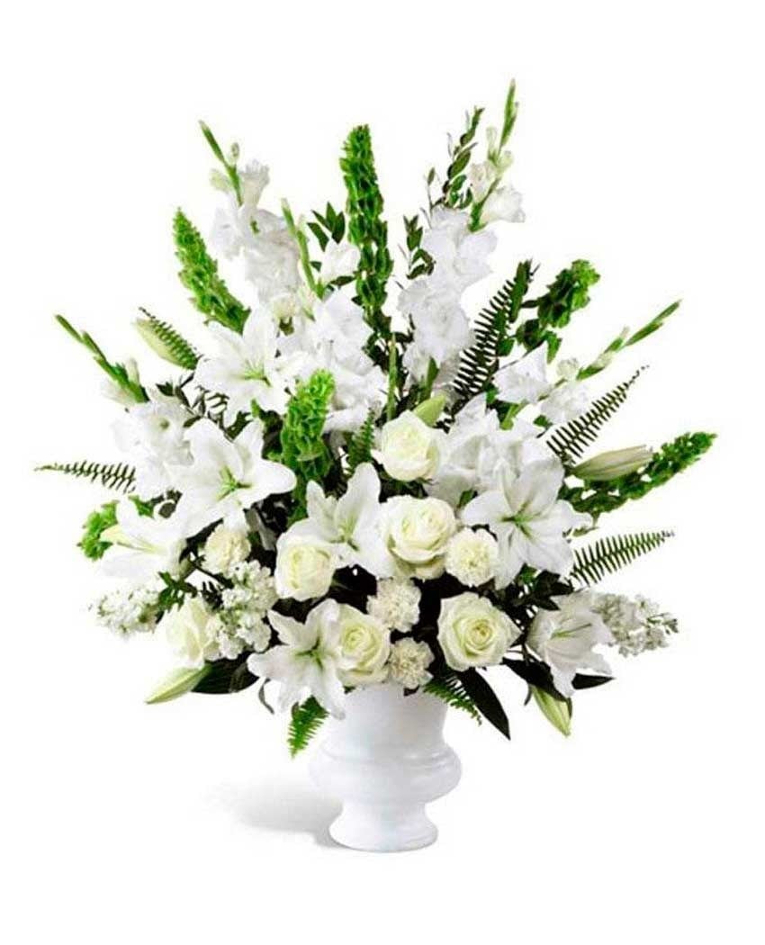 Centro de flores para funerales hecho con forma piramidal y compuesto con gladiolos, claveles, rosas, alhelí y verdes variados, en tonos blancos, blanco verdoso o con un ligero toque crema. El precio del arreglo floral para difuntos incluye entrega urgente y gratuita en tanatorios, velatorios, iglesias y capillas, cinta con dedicatoria, personal, familiar o de empresa e I.V.A.