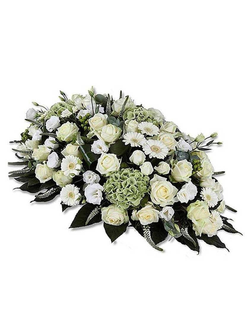 Hermoso centro de flores para funeral ovalado hecho en forma de almohadón funeral en tonos blancos verdosos y cremas. Entre otras flores, está hecho con rosas, verónicas, margaritas, claveles y lisianthus. El precio que figura es precio final con todo incluido: Entrega urgente, cinta con dedicatoria escrita; personal, familiar o de empresa e I.V.A.