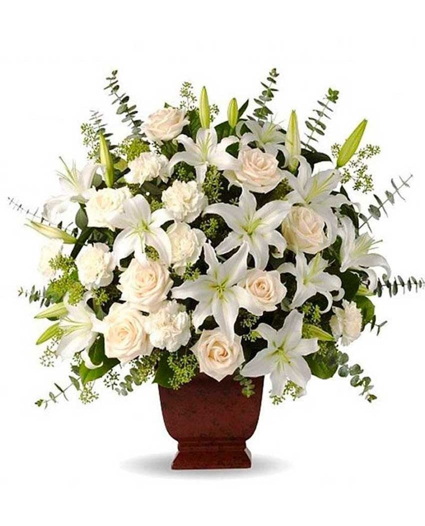Centro de flores para funerales, elegante y clásico en el que destacan los suaves contraste de color entre las hermosas flores de los lirios y las rosas. El precio incluye entrega urgente en tanatorios, iglesias, capillas y velatorios de Madrid, cinta con dedicatoria personal, familiar o de empresa e I.V.A. Para hacer entregas de flores en cementerios, tumbas o panteones, ha de ponerse en contacto , vía telefónica, con nosotros de manera inexcusable, para valorar la entrega.