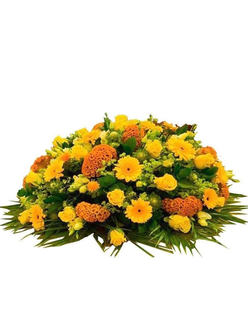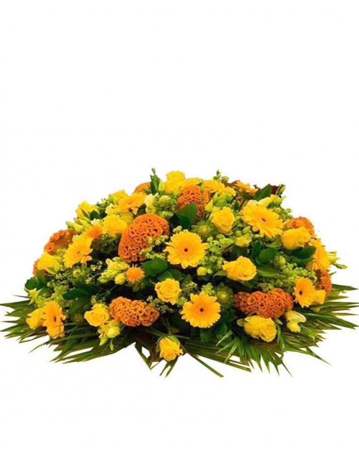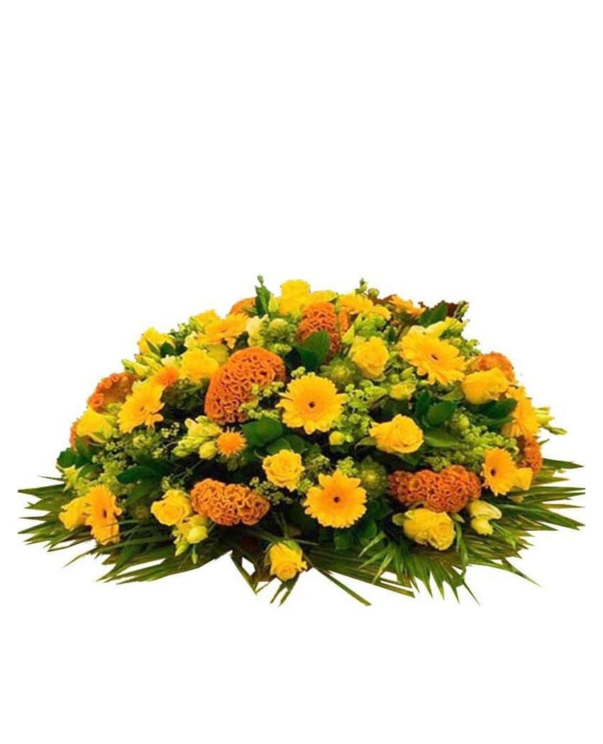 Centro de flores fúnebre, original, intenso y luminoso. Para su confección, entre otras flores se utilizan rosas amarillas, gerberas y celosías. Tanto la entrega urgente en tanatorios capillas velatorios e iglesias de Madrid como la cinta con inscripción dedicatoria, personal, familiar o de empresa y el IVA están incluidos en el precio que figura en el arreglo floral funerario. Haz tu pedido online, directamente, utilizando el carrito de la compra o bien, si lo prefieres y te resulta más cómodo, llama por teléfono a cualquiera de nuestras floristerías del tanatorio.