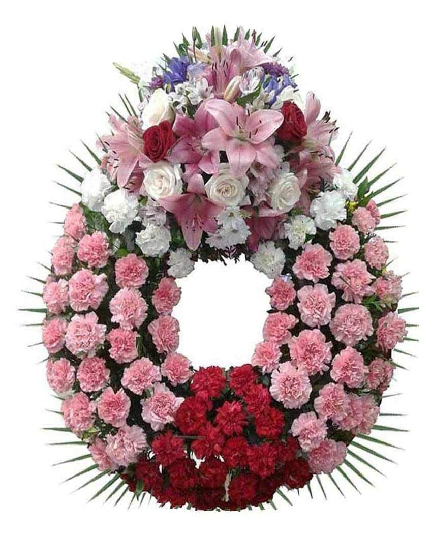 Composición floral funeraria clásica formada con secciones de claveles en color rosa, rojo y blanco, rematada con un centro superior hecho con flores variadas. Puede hacer su encargo, directamente online, o llamando por teléfono a cualquiera de nuestras floristerías. Está disponible en tres tamaños. Nuestros precios incluyen I.V.A, envío urgente a velatorios, capillas y tanatorios de Madrid y, según el tamaño escogido, cinta con dedicatoria personal, familiar o corporativa y caballete de madera para los tanatorios en los que este elemento es necesario.