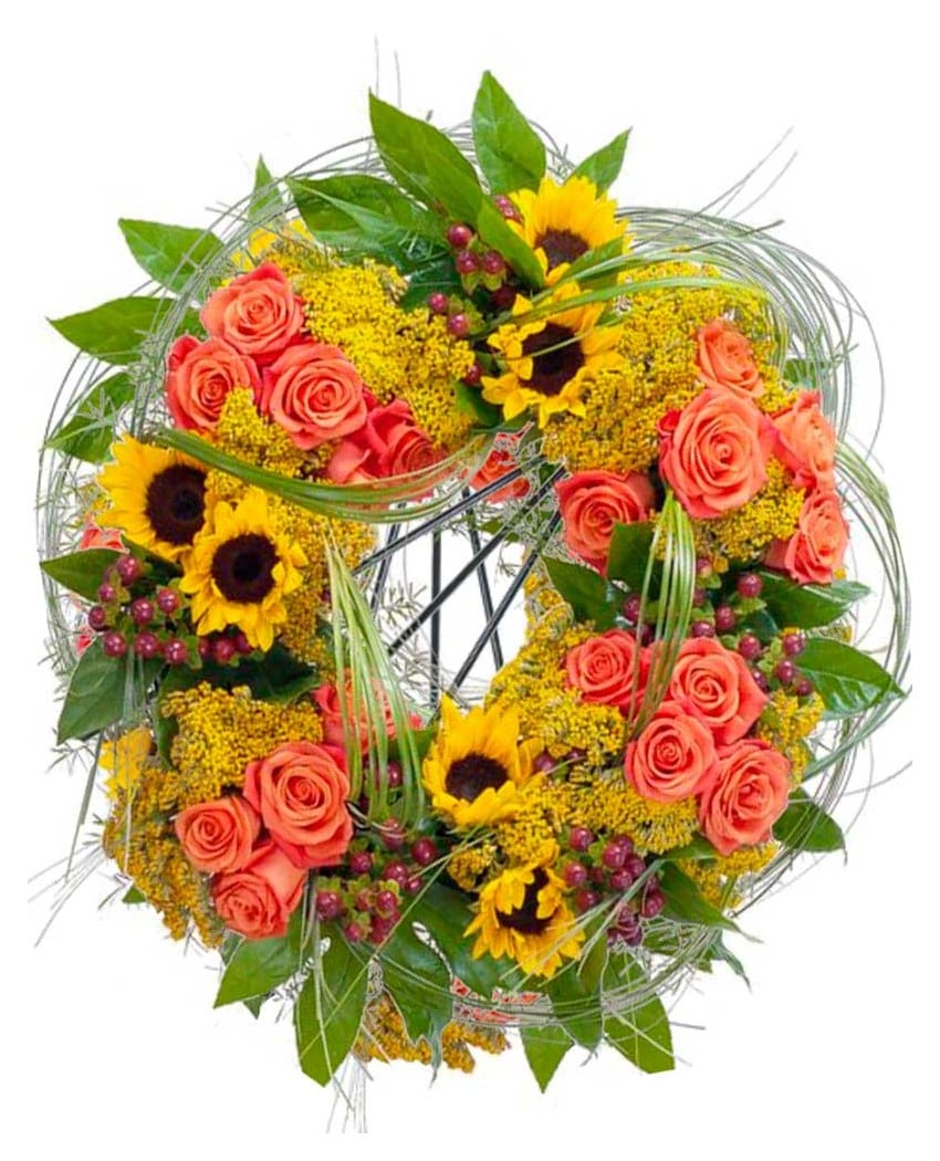 Hermosa e imponente corona de flores , luminosa e intensa, con 1m de altura, hecha con , entre otras flores, con girasoles, rosas y solidago. El precio incluiye I.V.A, banda dedicatoria, caballete, en su caso, y entrega urgente en Tanatorios de Madrid. El pedido puede hacerse online directamente, mediante el carrito de compra o llamando por teléfono a cualquiera de nuestras floristerías del tanatorio.