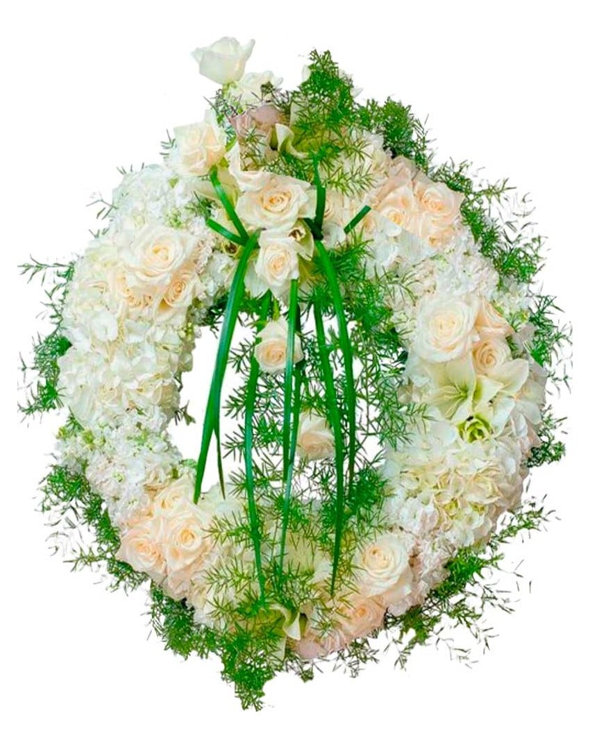 Imponente y hermosa corona hecha con flores variadas, utilizando transiciones de color suave pero con un contenido visual muy intenso y rematada con rosas blancas en la parte superior. El precio incluye I.V.A, entrega urgente y gratuita en tanatorios de Madrid, banda dedicatoria, y caballete de madera en el caso de que el tanatorio lo requiera. Puede realizar su encargo, online directamente, o mediante llamada telefónica a cualquiera de nuestras floristerías del tanatorio.