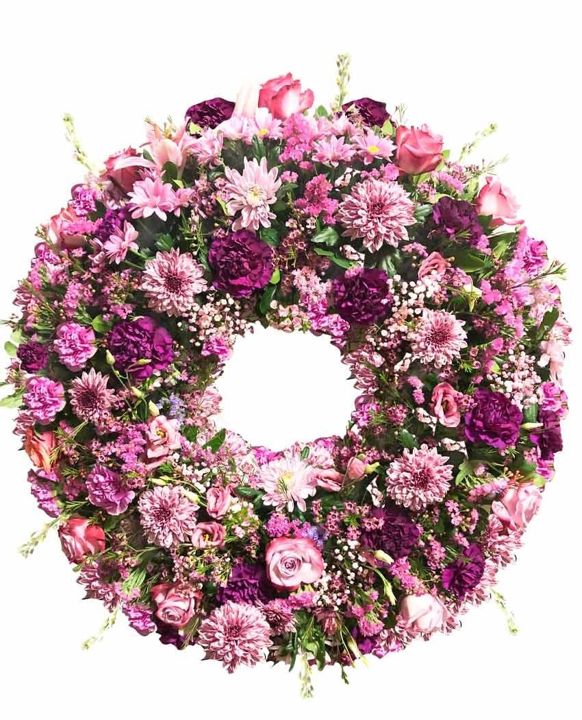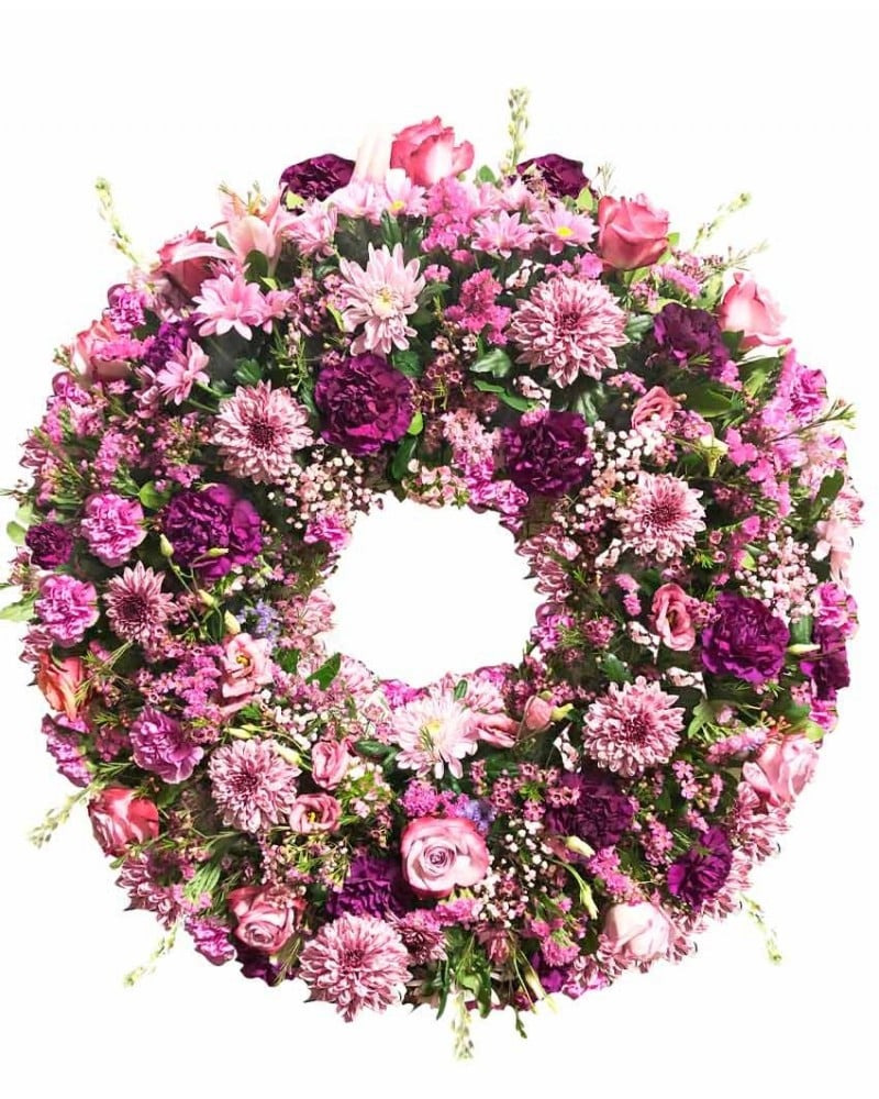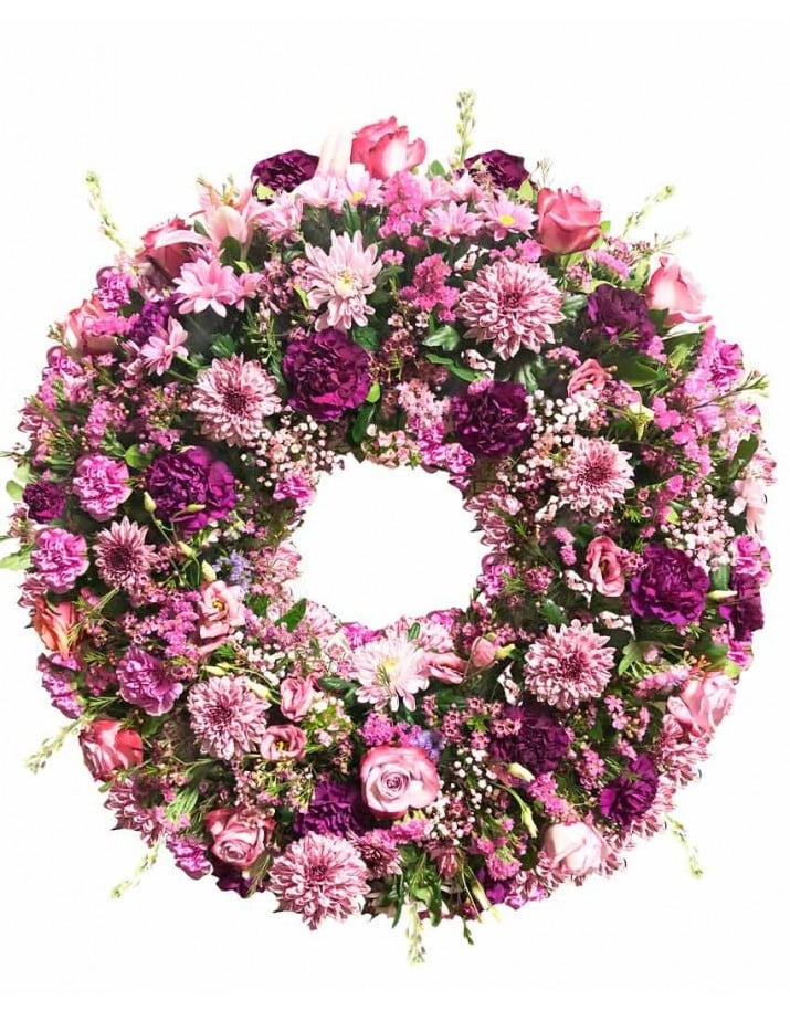 Corona de flores fúnebre diseñada utilizando flores con tonos granates, rosas y lavanda. Anastasias, claveles, paniculata, rosas, alhelí o dragonarias, etc. En el precio está incluido el I.V.A, transporte urgente a tanatorios, capillas, iglesias y velatorios de Madrid, cinta dedicatoria, y caballete soporte de madera, en el caso de que el tanatorio de destino lo requiera.
