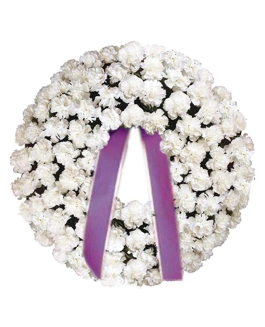 Corona de claveles blancos. Composición floral funeraria, sencilla clásica y elegante. El color blanco simboliza la paz y la armonía. En el rito funerario, la corona de flores es el icono más utilizado. En el precio está incluida la entrega urgente, el I.V.A, la cinta con inscripción dedicatoria, personal, familiar o corporativa y el caballete de madera que sirve de soporte a la corona, sólo par aquellos tanatorios en los que sea preciso. Puede realizar sus pedidos directamente online, mediante el registro de compra, o bien llamando por teléfono a cualquiera de nuestras floristerías del tanatorio.