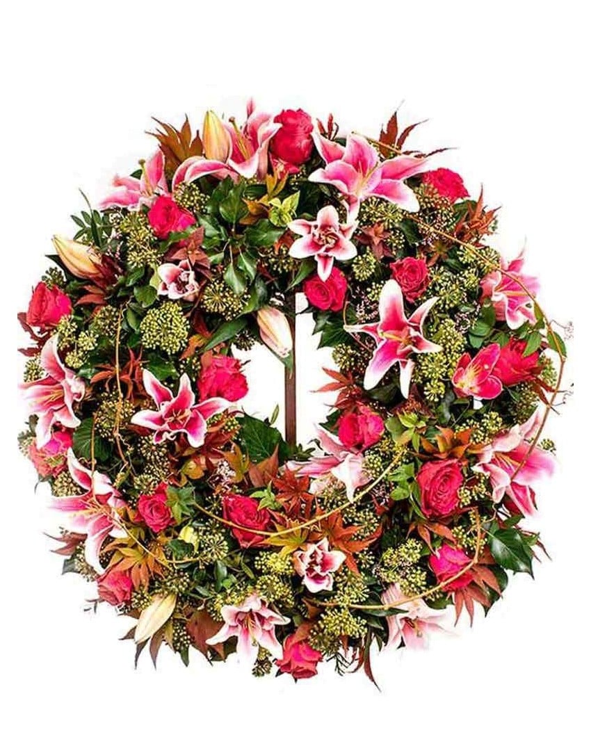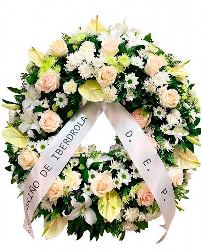 Corona de flores para funerales, elegante, suave y luminosa. Está hecha con flores variadas y verdes silvestres. En el precios están incluidos: I.V.A, cinta con banda dedicatoria, entrega urgente en tanatorios de Madrid y caballete de soporte en madera, para los tanatorios que lo requieran. Puede hacer sus pedidos online o llamando a cualquiera de nuestras tiendas, si el pedido es muy urgente, póngase en contacto con nosotros, a través del 609 843 910.