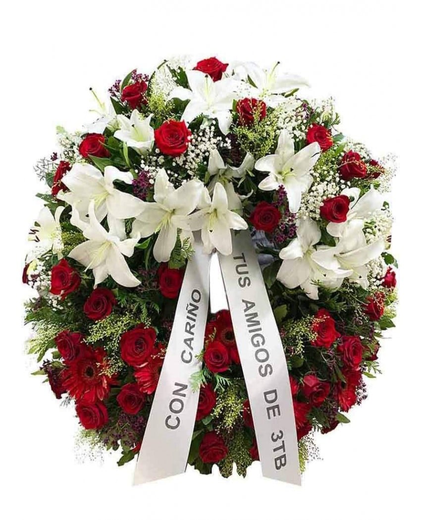 Corona de flores elegante, intensa y con un marcado diseño en el contraste de colores que le aporta presencia y distinción. Está hecha con Rosas, gerberas y Lirios orientales blancos. Su precio incluye entrega urgente en Tanatorios, velatorios o capillas, banda-cinta con dedicatoria personalizada, I.V.A y caballete-soporte de madera para los tanatorios que lo requieran. Puede hacer su pedido online o llamando a cualquiera de nuestras tiendas.
