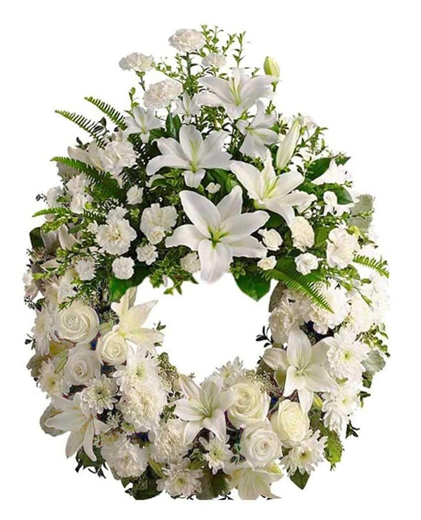 Clásica, elegante y luminosa corona funeraria hecha con azucenas, rosas y claveles. Puede realizar su pedido online o llame ahora por teléfono a cualquiera de nuestras tiendas. Las entregas en tanatorios de Madrid, son urgentes y gratuitas. Las flores de color blanco sintetizan sentimientos universales, acordes a valores que las hacen apropiadas para cualquier tipo de funeral.