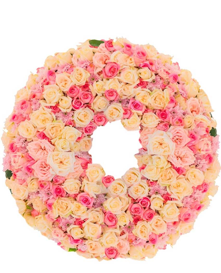 Corona de flores impresionante, de gran belleza y naturalidad, llena de luz, formas suaves y sentimientos intensos.. Está hecha con 275 rosas; rosas salvajes de jardín y otras variedades como la rosa vendela, la pink mondiale o la freedom. El precio incluye entrega urgente en tanatorios de Madrid, I.V.A, cinta con dedicatoria personal y caballete de soporte en madera para los tanatorios que lo requieran.