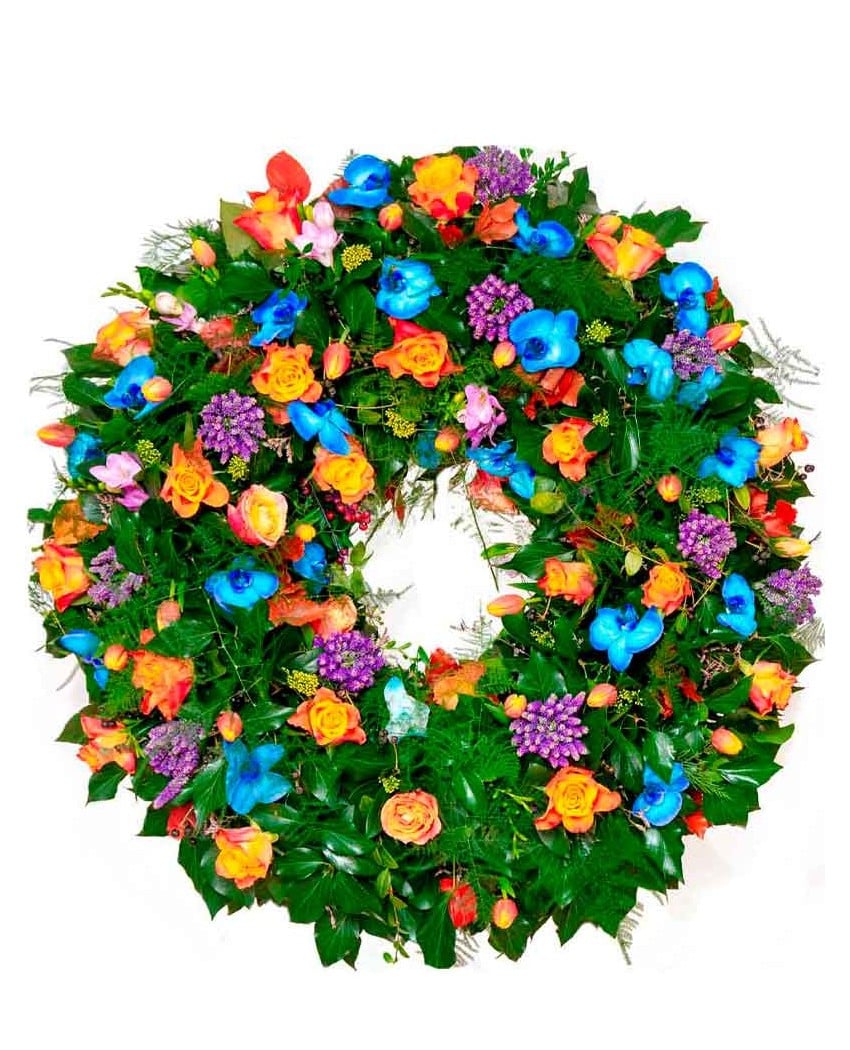 Preciosa corona de flores en la que destacan las flores azules de orquídea entre rosas, freesias, solidago y liatriz, entre otras flores. . El precio incluye entrega en tanatorios de Madrid y cinta dedicatoria con inscripción. Para agilizar el pedido también puede llamar por tfno. a cualquiera de nuestras floristerías o al 609 843 910. Puede realizar sus pedidos online o a través de nuestro icono de whatsapp.