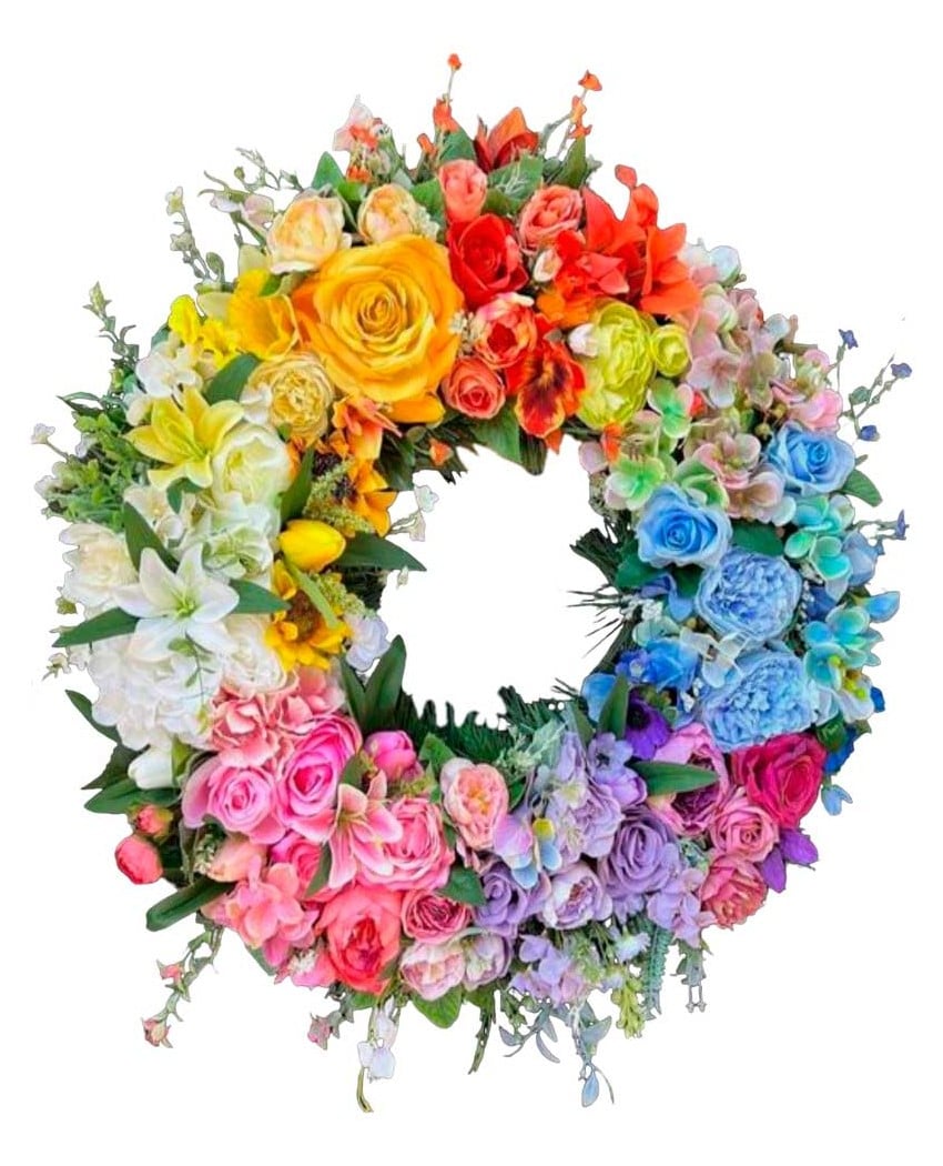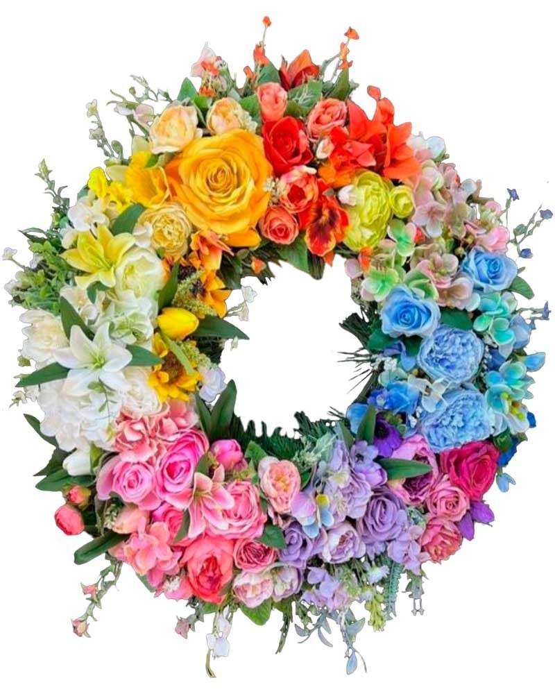 Corona de flores luminosa, clásica e intensa. Hecha con rosas , alstromerias, gerberas, alhelí, paniculata, hortensias, lirios, claveles, etc. El precio incluye I.V.A, envío urgente a tanatorios de Madrid. Puede hacer su pedido online o llamando por teléfono a cualquiera de nuestras tiendas o al 609 843 910. Los encargos se pueden hacer online o llamando por teléfono a cualquiera de nuestras tiendas. Tamaño Grande. Mide aproximadamente 1.30 de diámetro.