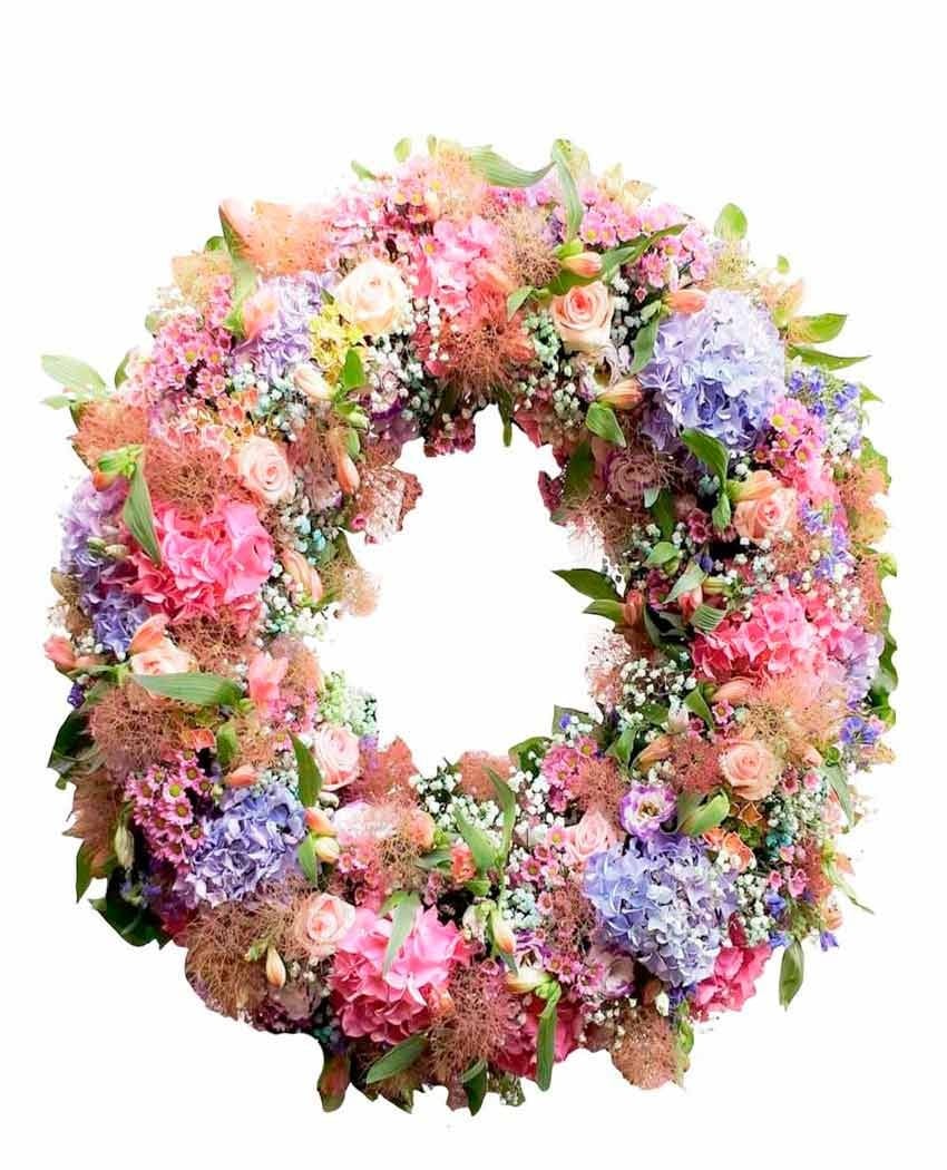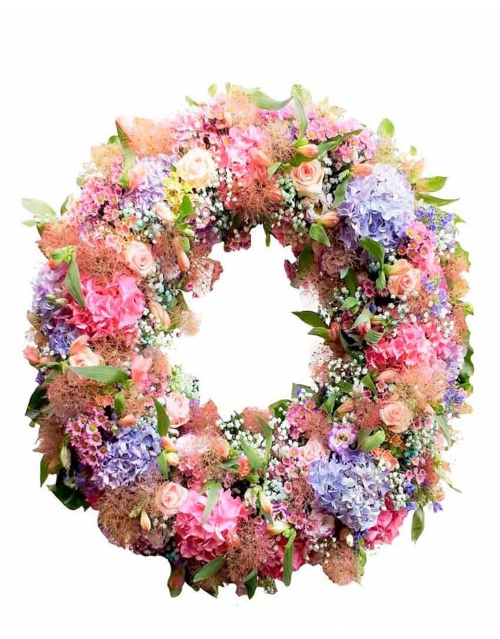 Hermosa y elegante corona de flores hecha con un estilo actual en el que destaca la combinación de diferentes tipos de flores. Esta corona fúnebre ofrece un aspecto visual luminoso, silvestre, hecha siguiendo los patrones más actuales del arte floral funerario. Es adecuada para cualquier ocasión, con un tamaño grande, aproximadamente 1 m de altura. Esta compuesta con hortensias, rosas, astromelias, etc. El precio incluye entrega gratuita y urgente en tanatorios, capilla y velatorios, cinta con dedicatoria personal, familiar, corporativa o de empresa, caballete de madera soporte e I.V.A.