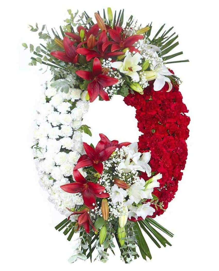 Corona funeraria en la que los dos centros de flores implementados en su estructura suponen elementos que integran de forma suave la transición visual que produce la combinación de blancos y rojos. Una asociación de colores que se utilizan mucho en el rito funerario español para simbolizar pesadumbre y duelo. Esta hecha con Lirios rojos y blancos y claveles de los mismos colores.