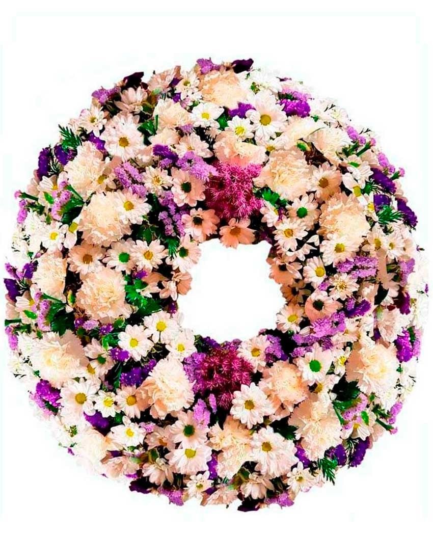 Corona de flores elegante hecha con colores que ofrecen un suave contraste entre blancos, morados y malvas. Haz tu pedido online, directamente, utilizando el carrito de compra o si te resulta más cómodo, llama por teléfono a cualquiera de nuestras floristerías del tanatorio, (Muy urgente llamando por teléfono 609 843 910). El precio de esta composición floral funeraria incluye entrega urgente en Tanatorios , capillas, iglesias y velatorios de Madrid, (en ciudades limítrofes consúltenos) y banda o cinta con dedicatoria personal, familiar, de empresa, corporativa o institucional.