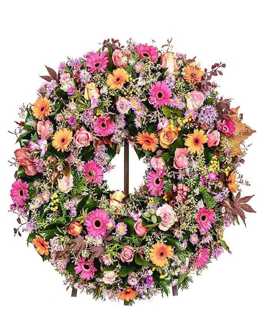 Corona de flores multicolor elegante y luminosa hecha con tonos suaves y notas de color rosa Está compuesta con rosas, gerberas, claveles, freesias, alstromerias y statice. Puede hacer su encargo, directamente online, o llamando por teléfono a cualquiera de nuestras floristerías. Los envíos son urgentes y gratuitos a los principales tanatorios, capillas y velatorios de Madrid y alrededores. El precio incluye envío, cinta con dedicatoria personal o corporativa, caballete soporte para los tanatorios que lo precisan e I.V.A.