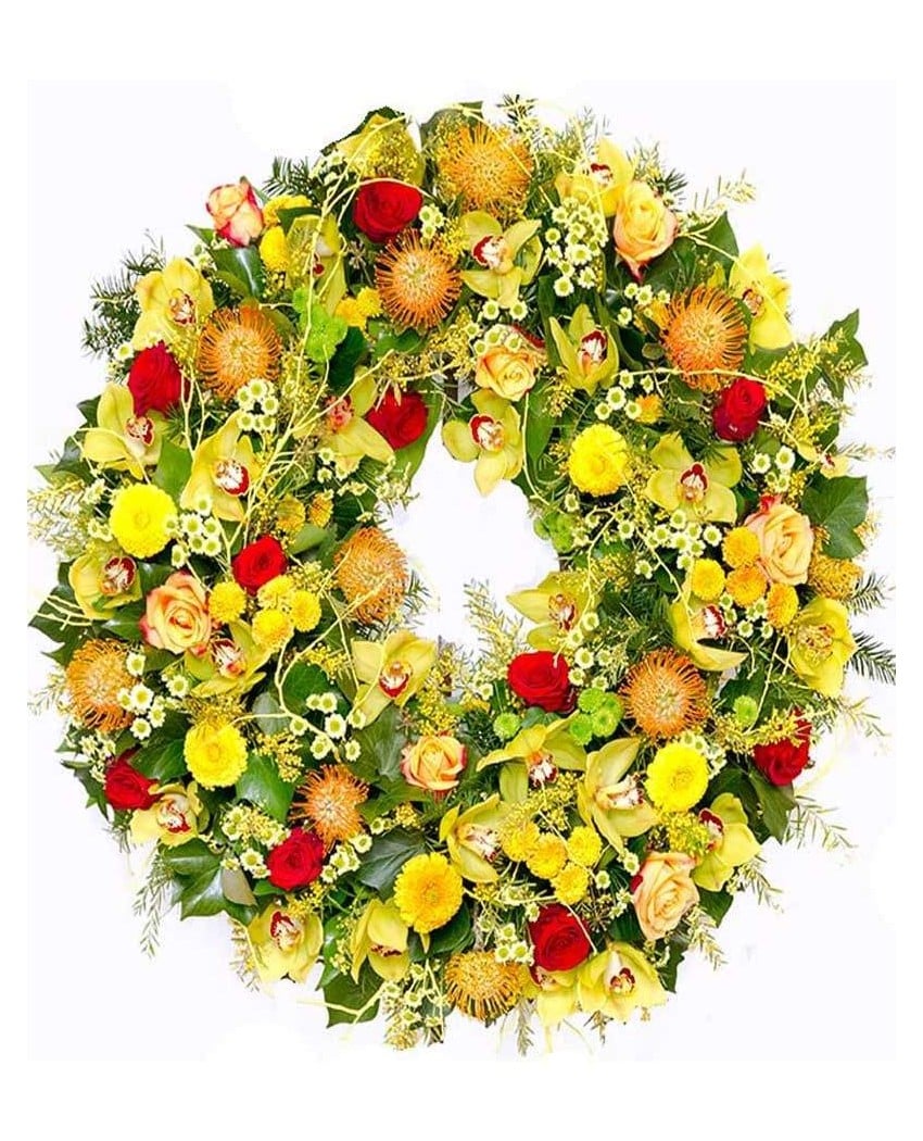 Hermosa corona fúnebre de lujo hecha con orquídeas cymbidium , rosas, lecaudendron y gerberas. Esta corona de flores puede ser personalizada a petición de nuestros clientes. El precio incluye envío urgente a todos los tanatorios, capillas y velatorios de Madrid. Puede realizar sus pedidos online, directamente o llamando por teléfono a cualquiera de nuestras floristerías.