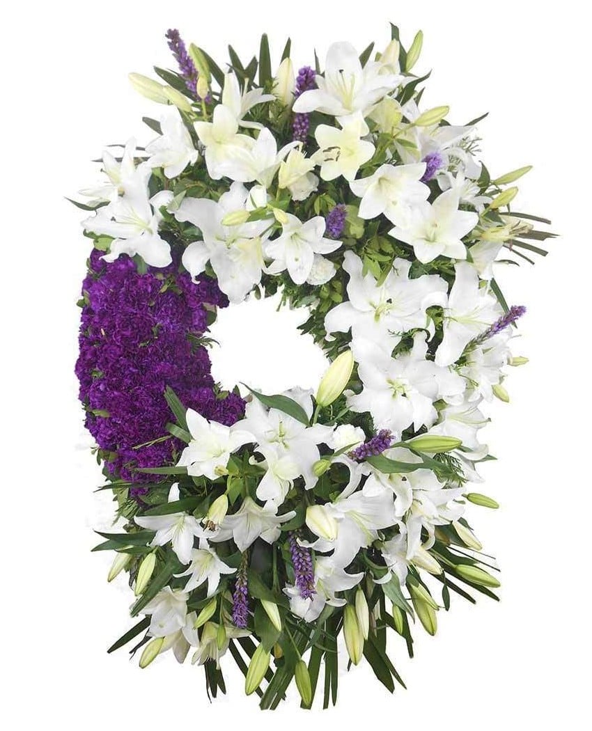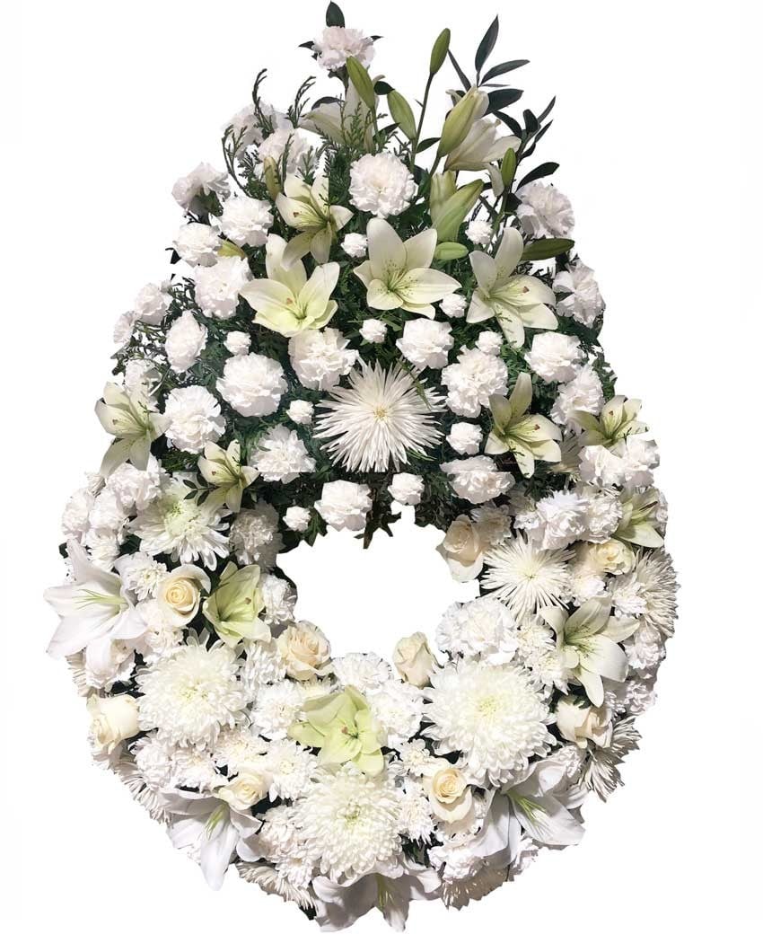 Preciosa y elegante corona de flores hecha con rosas blancas, paniculata, azucenas, claveles y margaritas. En el precio está incluida la entrega urgente en tanatorios , iglesias, capillas , velatorios de Madrid y cinta con dedicatoria personal o de empresa. Puede realizar su pedido online o llamando por teléfono a cualquiera de nuestras tiendas o al tfno. 609 843 910. Puede encargar online, directamente, utilizando el carrito de compra, o llamando por teléfono a cualquiera de nuestras floristerías del tanatorio.