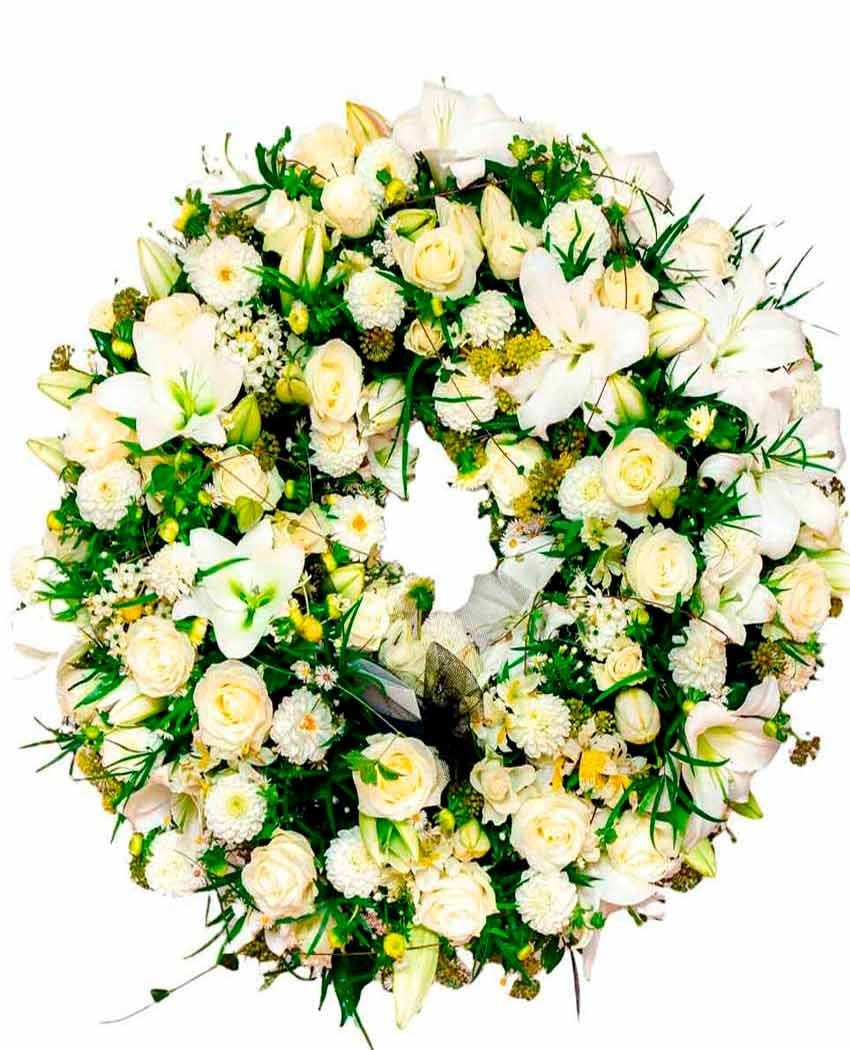 Corona de flores. Hecha con rosas blancas como flor principal, azucenas y claveles