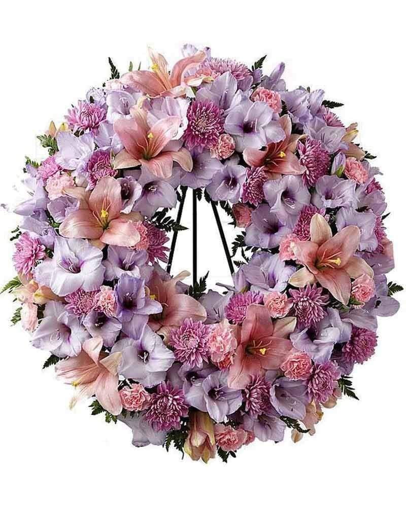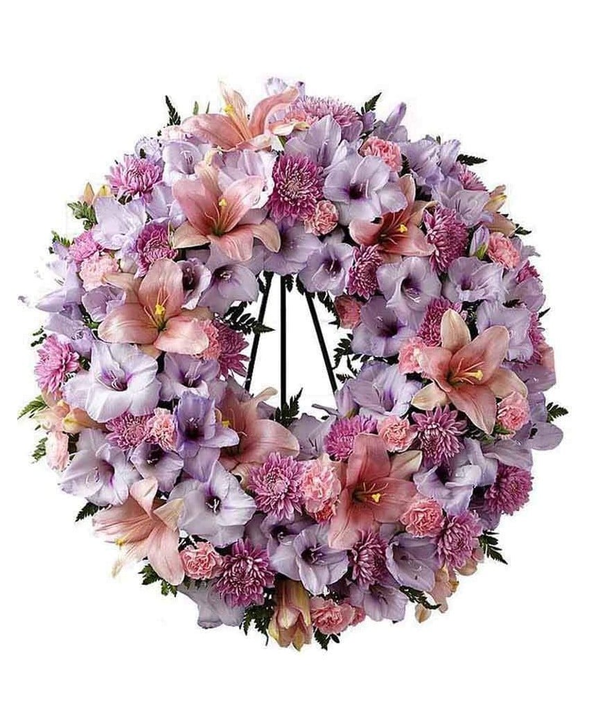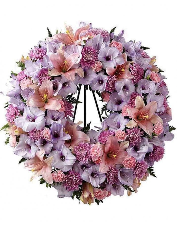 Hermosa corona hecha con flores variadas, entre otras, rosas, gladiolos y alstromerias, en la que destaca la uniformidad cromática conseguida con la combinación de tonos pastel fríos y unas notas de melocotón. En todas nuestras composiciones florales funerarias los precios incluyen desde el envío urgente y gratuito a todos los tanatorios de Madrid, hasta las cintas con dedicatoria personal o corporativa, soporte de madera e I.V.A.