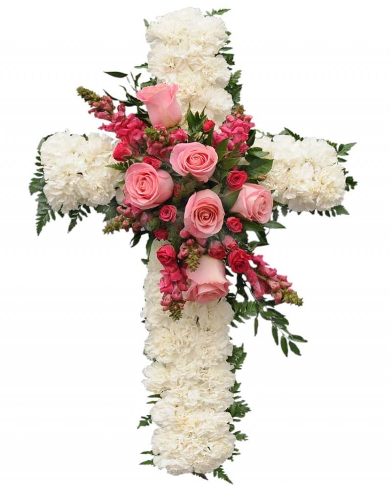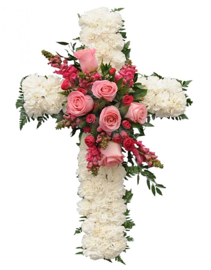 Cruz de flores que destaca por su contraste limpio y suave entre tonos blancos y rosados. El centro está hecho con rosas y dragonarias. En muchos lugares de España, San Jorge es la figura que derrotó al dragón; hemos querido, por tanto, asociar las flores de dragonaria al nombre de este Santo.