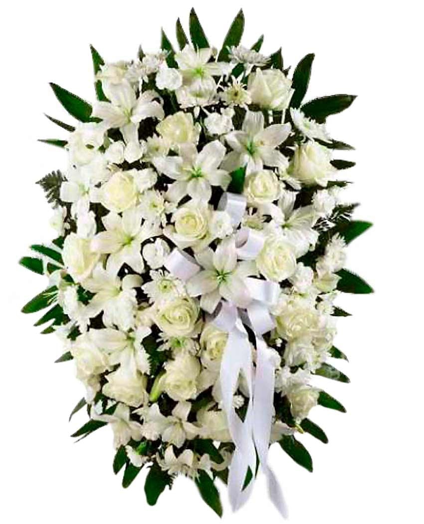 Composición de flores hecha para rendir tributo en funerales. Llena de luz e intensidad el diseño de esta palma está estructurado en base a colores blancos constituidos por azucenas o lirios orientales blancos, rosas freedom, del mismo color y hermosos y estilizados crisantemos de la variedad anastasia. El precio incluye entrega urgente en tanatorios de Madrid y cinta con inscripción dedicatoria, personal, familiar o corporativa.