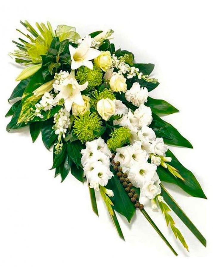 Este ramo es un homenaje floral póstumo para el difunto y una muestra de condolencia y solidaridad con la familia del fallecido. Los arreglos florales diseñados sobre el contraste de los colores verde y blanco son, actualmente, muy demandados. Las tendencias del arte floral van encaminadas hacia diseños naturales y con aires silvestres.