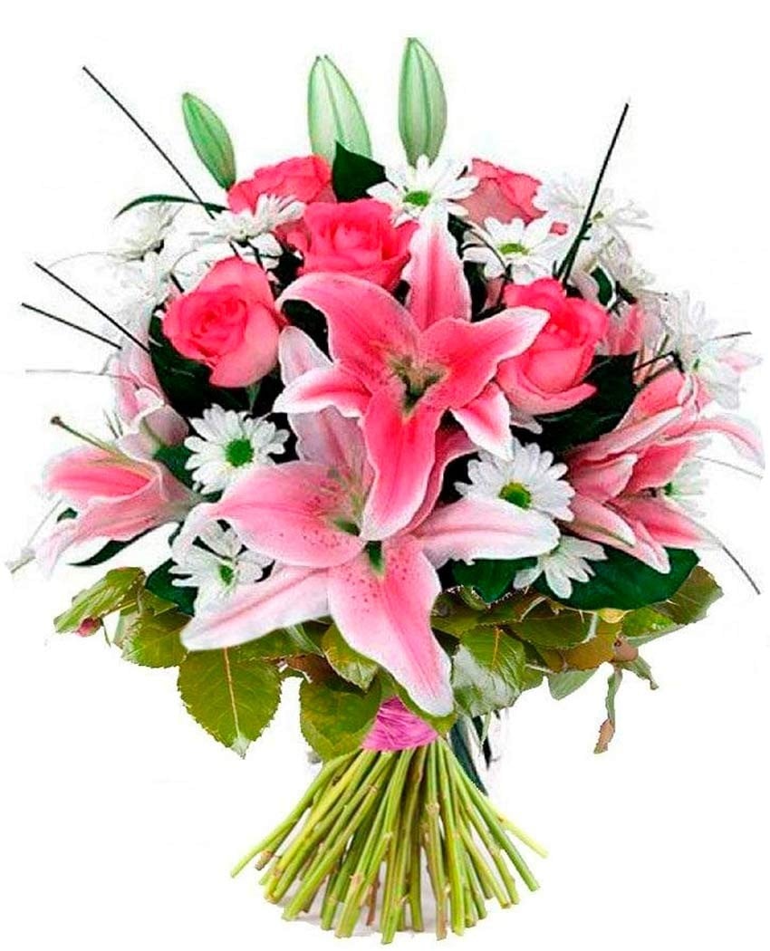 Ramo de flores para funeral hecho con los colores suaves que aportan las flores de los lirios, las margaritas y las rosas. Es una composición floral funeraria llena de luz y ternura cuyo precio incluye envío urgente en iglesias, velatorios, tanatorios y capillas de la ciudad de Madrid, envoltorio transparente, lazada y banda dedicatoria con texto personal, familiar, corporativo o de empresa.