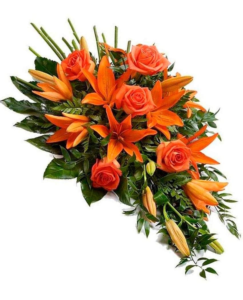 Ramo de flores para funeral elegante e intenso hecho con rosas y lirios de color de naranja. Diseño estructurado sobre una base horizontal de verdes variados que el aporta cierto aire de almohadón floral funerario. En el precio de este arreglo de flores está incluido el envío urgente a capillas, tanatorios, velatorios e iglesias de Madrid, envoltorios transparente, lazadas y banda con dedicatoria personal, de empresa o corporativa o familiar.